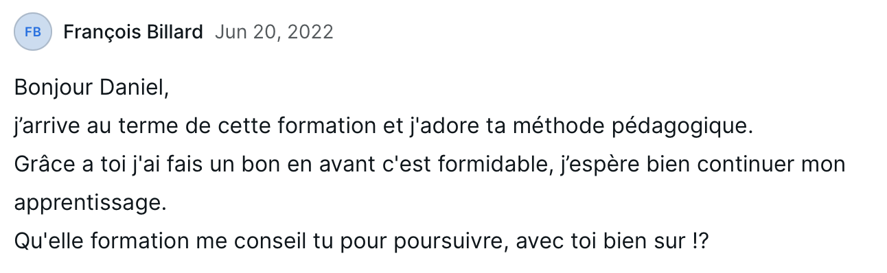 "Je trouve la formation géniale et l'approche et la pédagogie me convient parfaitement je te fais donc confiance pour la suite les étapes étant très progressives et d une grande efficacité.