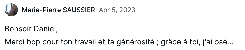 "Coucou Daniel! Franchement je conseille fortement ta formation...Elle est claire...super bien expliquée...Bref, je me régale d apprendre!! Merci pour ta simplicité, tes explications et ton grand cœur!!....Allez, c est l heure de m'y remettre!!...Bon week-end!!...."