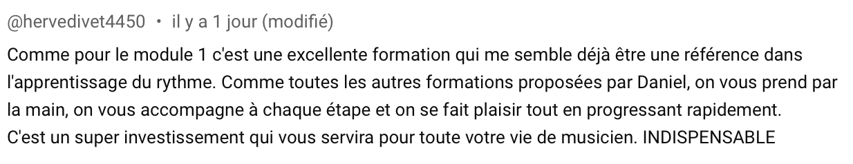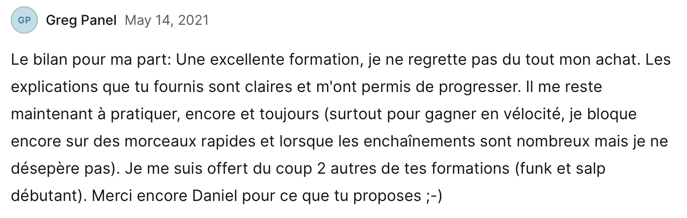 "j'arrive à la fin de la formation (je continue à travailler les exercices chaque jour quand même :-) ) et je voulais t'adresser un grand MERCI pour ce que tu fais et pour cette formation qui m'a redonné beaucoup de plaisir à jouer,moi qui ai fait un an de conservatoire il y a très longtemps ,je n'ai pas souvenir d'avoir autant kiffé l'instrument qu'actuellement.(je travaille environ 1h30 par jour voir plus)