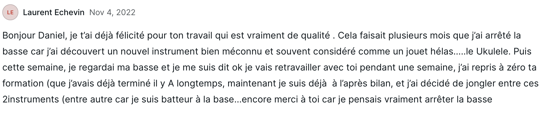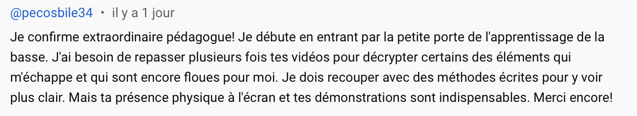 "C'est incroyable ! Après quelques jours à suivre assidûment tes conseils dans le vidéo précédentes et en les reprenant régulièrement , tu as raison sur toute la ligne : musculation des doigts et surtout de l'auriculaire, le cerveau qui bosse pendant les arrêts, le tempo qui rentre dans la tête, le pied qui accompagne,la basse qui sonne rond ... Daniel, t'es un génie !